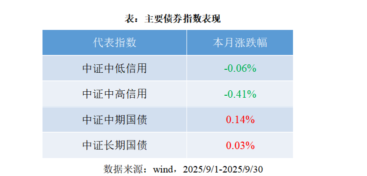 在国内投资者风险偏好回升冲击下,国内债市对于经济数据走弱等基本面利好并不敏感,但对股市上涨较为敏感,9月债市出现多次大幅下跌,全月各大券种跌多涨少。