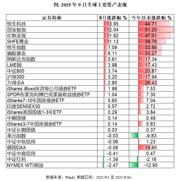2025年9月,全球金融市场风险偏好继续回升,恒生科技指数领涨全球权益资产。国内经济基本面稳步复苏,9月国内权益市场波动明显加大,创业板指数继续跑赢。