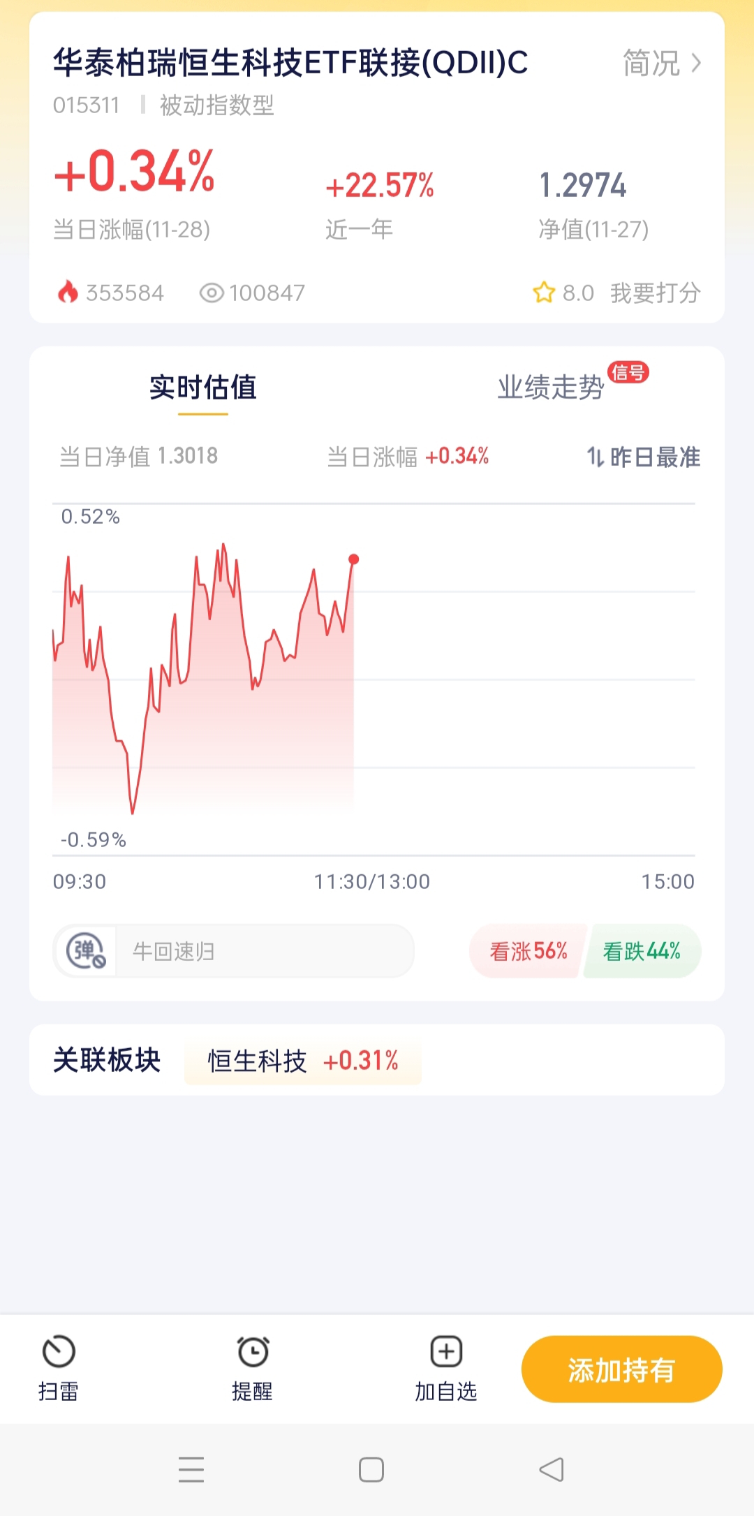 最近恒生科技板块一直是我关注的重点,今天它又涨了0.31%,走势还算可以。华泰柏瑞和这个板块关联度很高,今天它的实时估值涨了0.34%,和板块的走势很契合。而且它近一年的涨幅有22.57%,这个成绩还是挺亮眼的。对于那些想投资科技板块但又不知道怎么选个股的人来说,选华泰柏瑞的这个产品就挺好,它能帮你直接分享板块的收益,风险相对也小一些。$华泰柏瑞恒生科技ETF联接(QDII)C$ #3800点的A股值得加仓吗?#