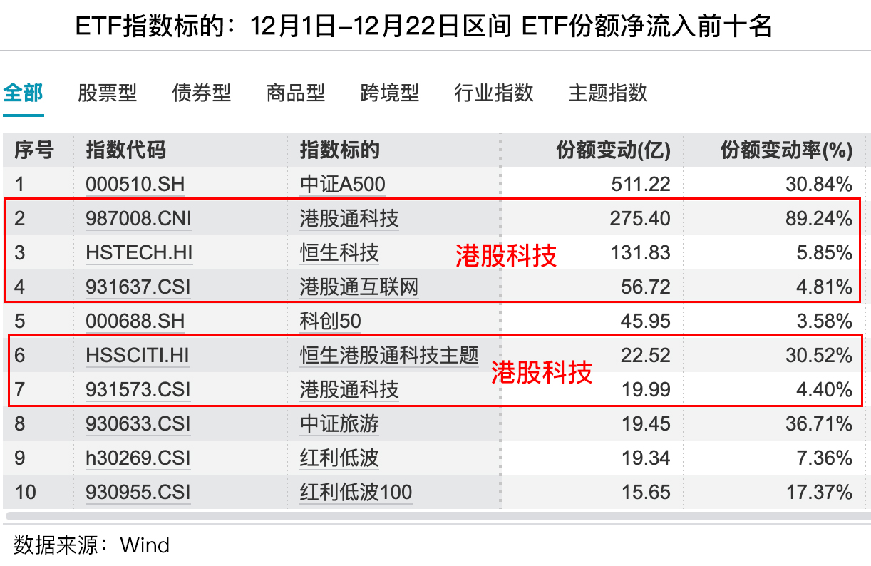 Wind统计显示,今年12月1日-22日区间,宽基指数主要流向中证A500和科创50,主题指数主要流向港股科技和红利资产。看来明年投资布局上,“科技+红利”哑铃配置依然比较稳妥。