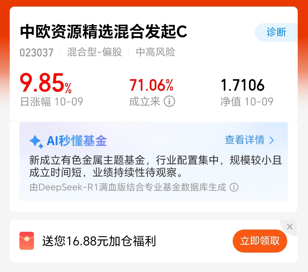 $中欧资源精选混合发起C(OTCFUND|023037)$今天上涨9.85%,接近涨停板了。比单纯的黄金、铜都要猛。
