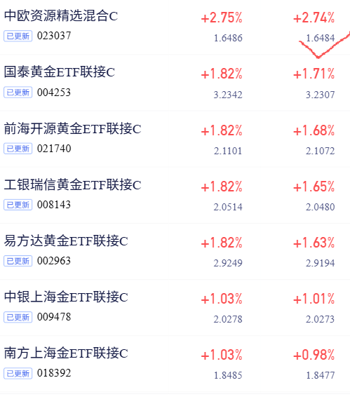 涨势喜人,红色一片,$中欧资源精选混合发起C(OTCFUND|023037)$涨幅2.74%,涨的比黄金好,黄金近期有所波动,资源基金经理主动管理调仓位,能力很强。