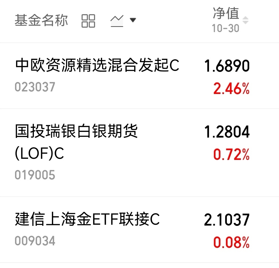 $中欧资源精选混合发起C$ 今天涨2.46%,资源股表现还不错,也挺能涨的。目前看重仓了铜铝贵金属,比黄金涨幅还好一些