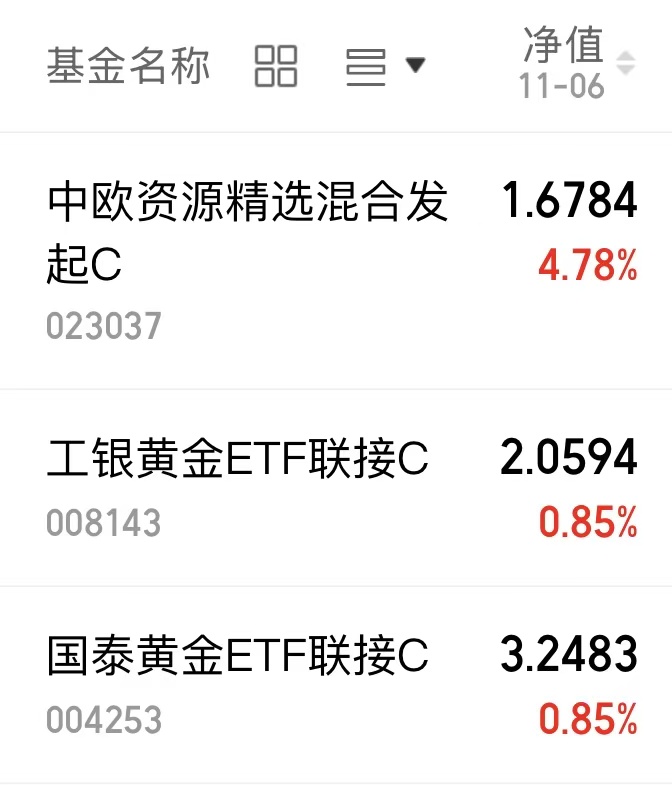 今天的A股和港股还有黄金都迎来上涨了,盘面非常的不错呢,我还是觉得均衡持仓比较好,这样可以提高收益,降低风险,黄金资源金属方面最近给力呢,看看这几个基净值