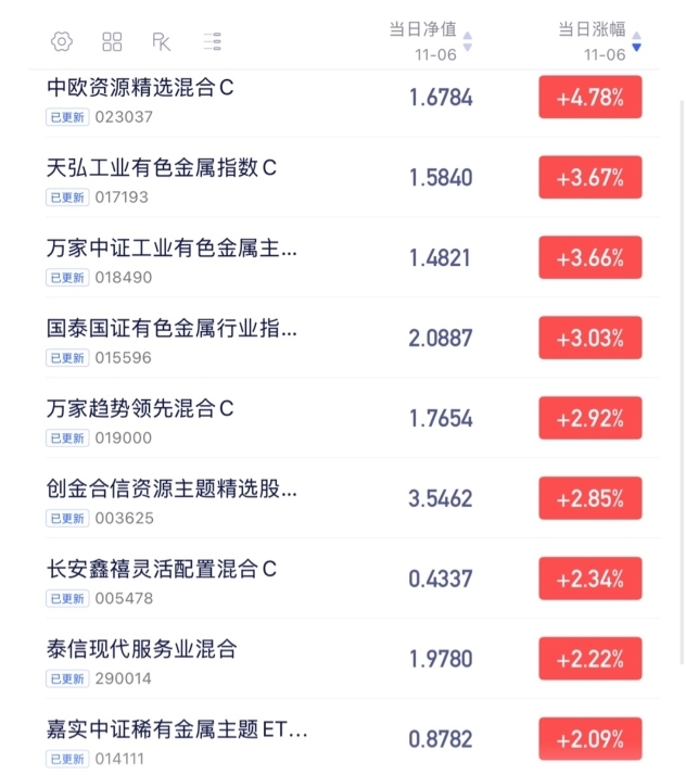 最近有色金属板块表现挺强的,几个相关基金今天都涨了不少。我看现在全球货币政策比较宽松,加上新能源、高端制造这些产业对金属资源的需求在增加,行业的供需关系变得紧张起来。