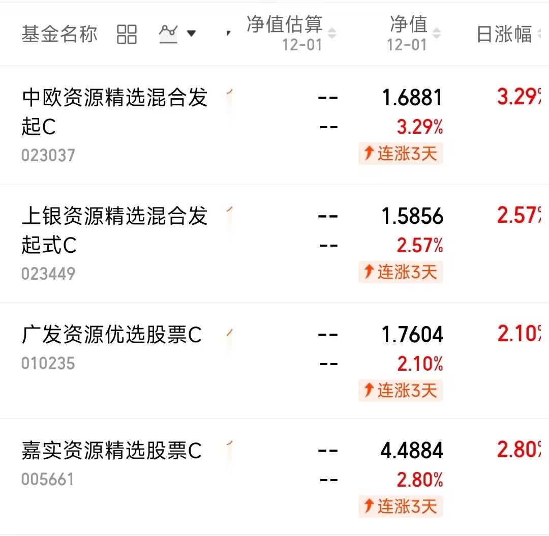 现在的行情,有色板块近期的涨幅不错,每一轮行情当中,有色板块都能排进前5名。今天的有色板块当中,$中欧资源精选混合发起C(OTCFUND|023037)$今日上涨3.29%,$上银资源精选混合发起式C(OTCFUND|023449)$上涨2.57%,$嘉实资源精选股票C(OTCFUND|005661)$上涨2.8%。