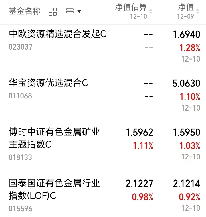 今日A股整体走弱,科技板块行情分化,还好午后拉升回来。有色金属及工业金属板块等资源品今天表现比较强势,黄金也小幅反弹了,持有有色的小伙伴能有不少收获啦。看看今晚净值表现情况: