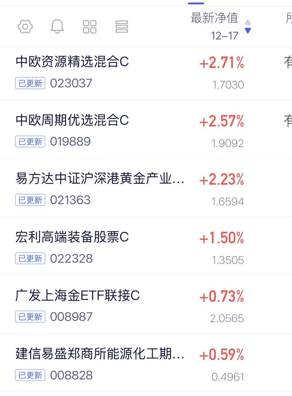 今天反弹,反包了这两天跌幅的一大半了,除了科技,能源方向也不错,锂价狂飙,能源金属后劲仍在,中欧家族的能源两兄弟首当其今天$中欧资源精选混合发起C$ 涨2.71%,$中欧周期优选混合发起C$ 今天上涨,比同类多跑赢了不少,主动选股能力强