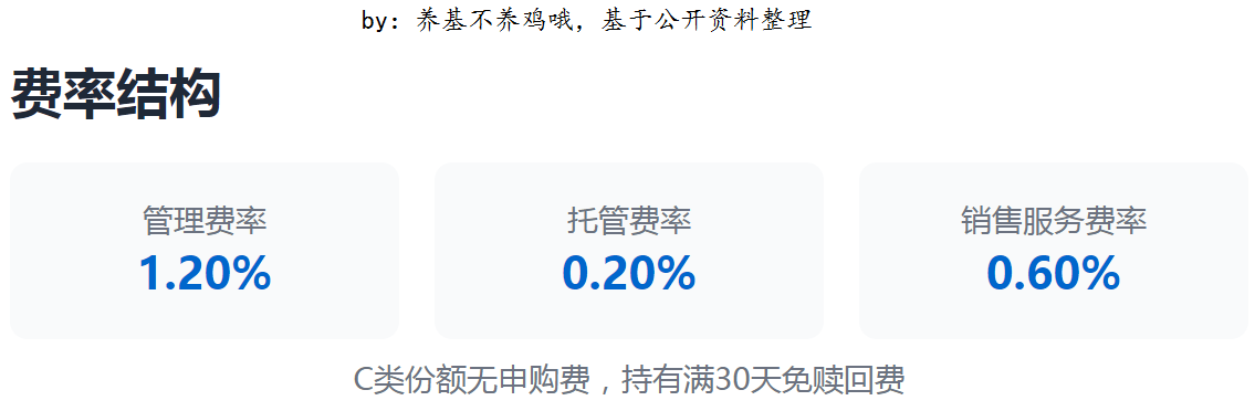 我特别喜欢这支基金的费率结构:管理费率1.20%、托管费率0.20%、销售服务费率0.60%,C类份额无申购费且持有满30天免赎回费。这对于像我这样的普通上班族来说,非常友好,减少了投资成本,让长期投资更有可行性。