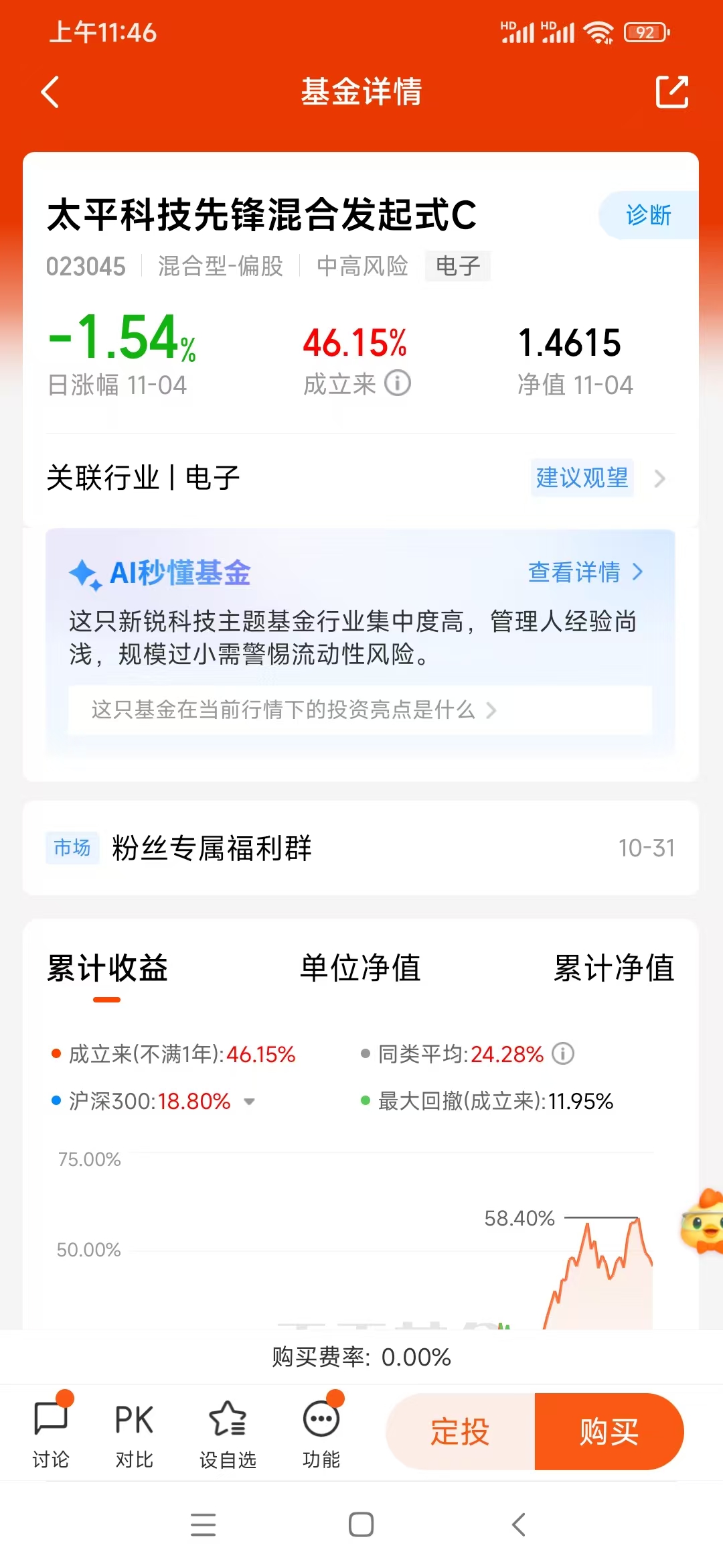 先来看业绩。太平科技先锋混合发起式C这支基金成立于今年4月,虽然成立时间不长,但自成立以来的涨幅达到了46.15%,在同类中排名靠前,表现相当亮眼。