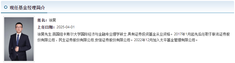 基金经理徐昊,英国纽卡斯尔大学国际经济与金融专业理学硕士,拥有证券投资基金从业资格。其职业生涯始于2017年1月,先后在联讯证券、民生证券、安信证券等知名券商从事研究工作。2022年12月,徐昊加入太平基金管理有限公司,2025年4月1日起担任太平科技先锋混合发起式基金的基金经理。