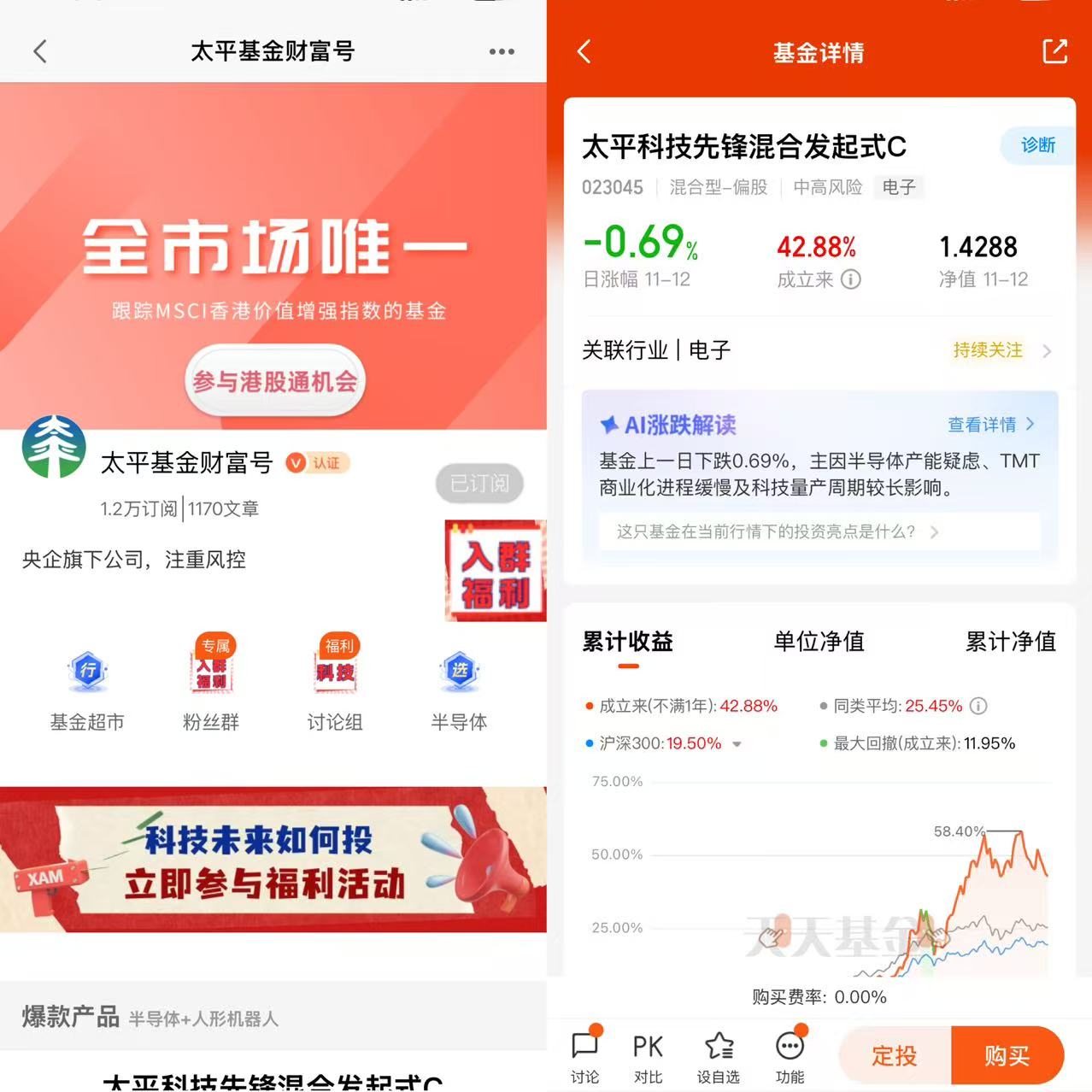 太平科技先锋混合发起式C在2025年的表现可谓亮眼。根据最新数据,截至2025年11月12日,该基金今年以来(2025年1月1日至11月12日)的收益率达到42.88%,显著跑赢同期沪深300指数涨幅和业绩比较基准的收益率。
