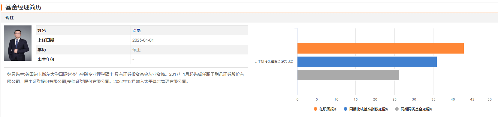太平科技先锋混合发起式C基金由徐昊担任基金经理,其个人背景如下: