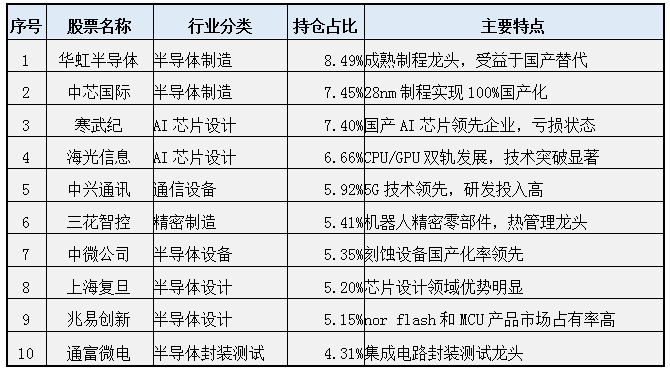 1. 选股能力:基金重仓股包括华虹半导体(8.49%)、中芯国际(7.45%)、寒武纪(7.40%)、海光信息(6.66%)等半导体企业,以及三花智控(5.41%)等机器人零部件企业,这些企业在各自领域均有较强的技术实力和市场地位。