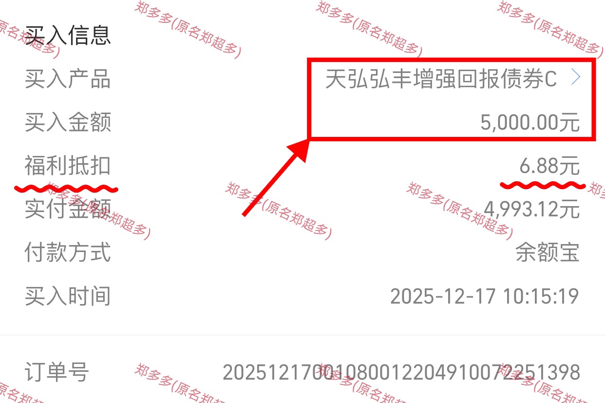 从业绩看,近6个月上涨9.76%,近一年上涨11.78%,表现也是有目共睹。评论区下滑到6楼还有红包,不等了,我个人继续入手5000元$天弘弘丰增强回报债券C$ ,期待多多收蛋。