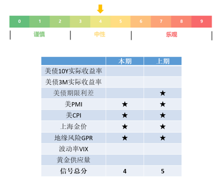 信号说明:交银黄金信号系定量化模型,其分值由9指标综合计算得出,信号分值越高越看好。如果分数<1/3,则看空黄金;如果分数>=2/3,则看多黄金;其余则对黄金观点中性。交银黄金加基金投顾策略根据黄金模型月末信号,定期调仓黄金类资产持仓比例,力争提升黄金投资性价比。