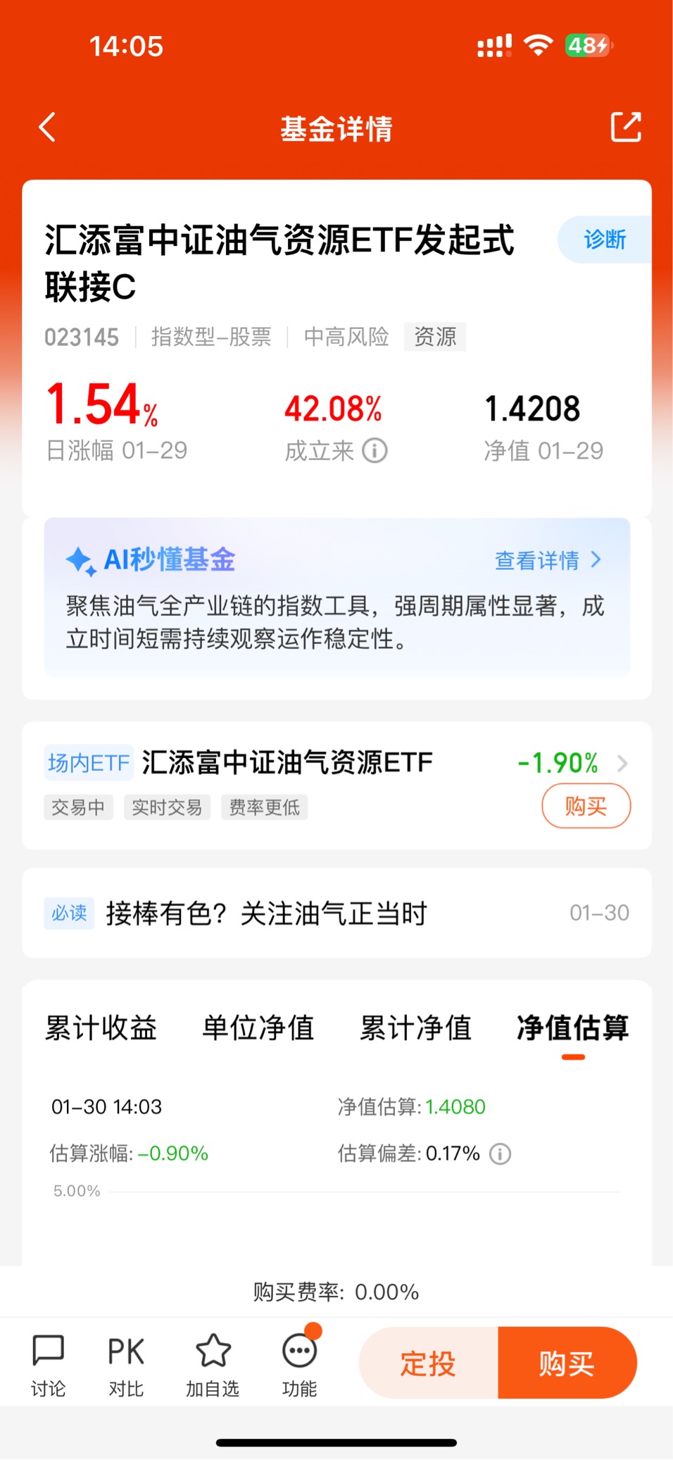 现在妥妥的资源为王的时代,之前没跟上黄金、有色的千万别再错过油气了!眼下有色都到止盈点了,换成油气才是明智之选,后续上涨空间可比有色大得多。而且现在不少QDII石油类基金都限购了,汇添富中证油气资源ETF联接C(023145)就特合适,单日不限购还7天免赎回费,入手超方便。这只基跟踪的指数超纯粹,前十大成分股全是油气标的,锐度和弹性都拉满,聚焦油气开采、设备、炼制到运输销售全产业链,只挑有优质储量、低成本和稳定分红的油气巨头,成分股就44只,宁缺毋滥保证了指数质量,近六期、一年、三年收益在同类里都是领先的。近期美国冬季风暴让原油日产量少了200万桶,美伊地缘冲突又持续发酵,油价涨势动力超足,油气板块长期配置价值拉满,用自身确定性应对外部波动太香了,这波布局油气就选这只基,一键拿捏产业链红利,不过上车前还是得先掂量下自己的风险承受能力哈。