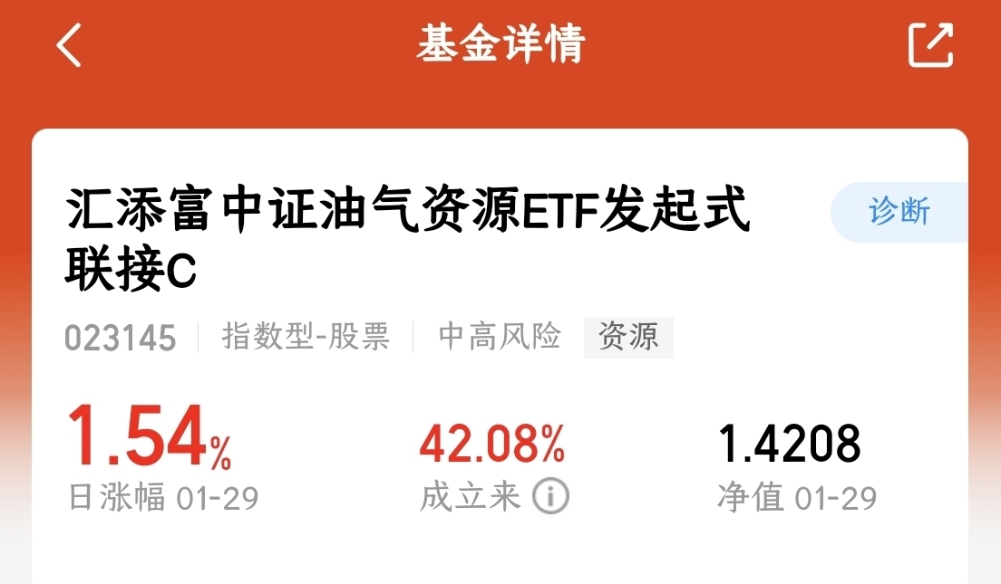 我关注的$汇添富中证油气资源ETF发起式联接C$ 昨日上涨1.54%,近一月涨幅18.63%,近半年涨幅36.41%,远超同类均值,表现还是很不错的。另外该产品满7日,免赎回费,支持灵活申赎,为布局油气板块提供便捷工具。