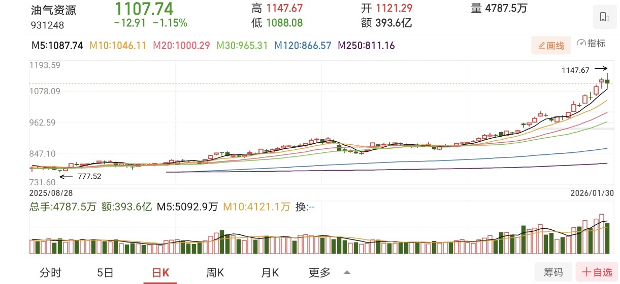 $汇添富中证油气资源ETF发起式联接C$ (023145)是中证油气资源指数(931248)的ETF联接基金。该指数从沪深市场中选取业务涉及石油天然气的开采、服务与设备制造、炼油加工、运输及销售领域的股票。从技术面来看,指数今天小幅回撤1.08%,走出一根带长上下影线的绿十字星,上影线创新高,下影线回踩5天均线获得明显支撑,K线重心也没有明显下移,震荡上行趋势稳健。从今天的盘面来看,其表现要明显强于金属有色。