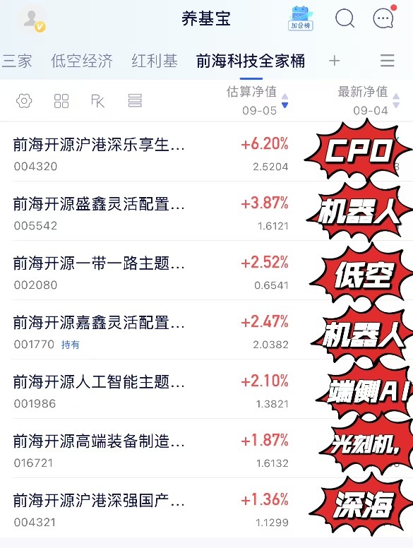 前海科技全家桶,以为今天还得跌 昨天只敢补了一点点啊 没想到。。。。 $前海开源盛鑫C$$前海开源嘉鑫C$$前海开源嘉鑫C$$前海开源高端装备C$$前海开源嘉鑫C$$前海开源一带一路C$