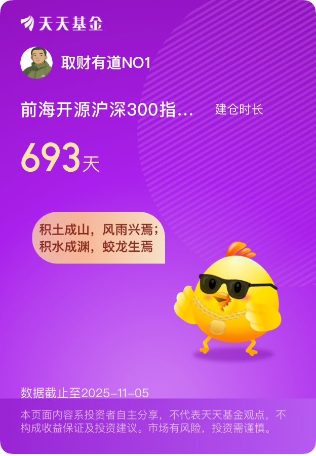 在投资的世界里,我始终相信“稳稳的幸福”来源于长期的坚持与信任。作为一名初入职场的年轻人,从2023年开始定投前海开源沪深300指数基金至今,这份坚持不仅帮我攒下了第一桶金,更让我深刻体会到指数化投资的魅力——简单、透明、省心。就像给自己请了一位永不下班的理财管家,不需要时刻盯盘,却能稳稳享受中国经济成长的红利。