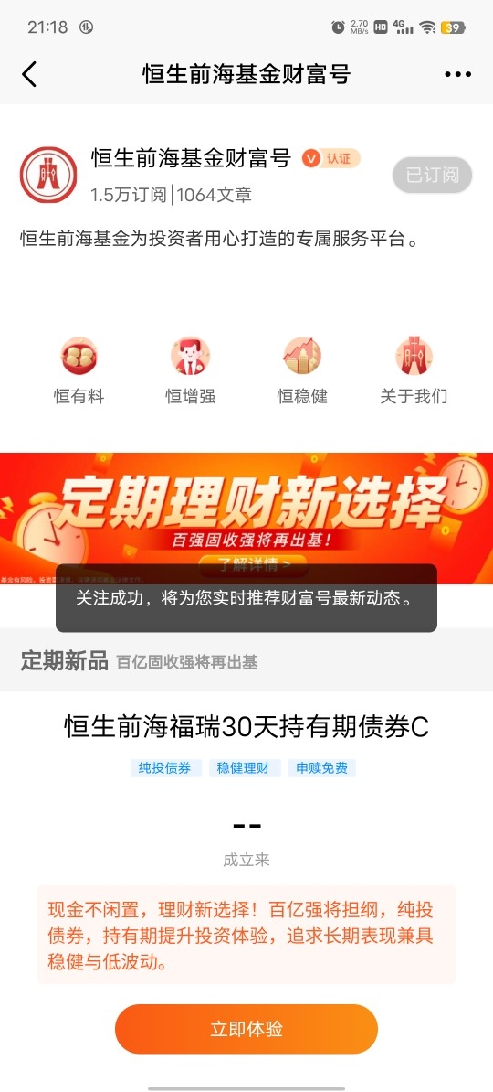 恒生前海福瑞30天持有期债券C,真不错!