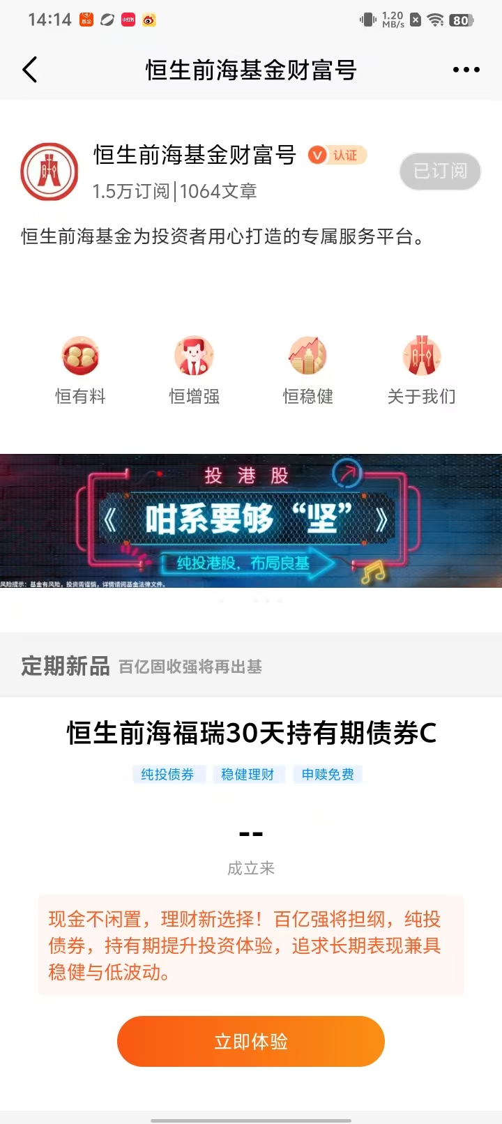 恒生前海福瑞30天持有期债券C在严格控制风险和保持良好流动性的前提下,纯债不投股,追求长期稳健收益,非常适合闲钱稳健理财! 同时搭配30天的滚动持有期,不仅可以给予基金经理更长的择时周期、更大的杠杆空间、更高的流动性溢价,也可以挖掘与扩大较大的收益空间。相比于其他类型的债券基金,短债策略的持有期债基通常具有较低的投资门槛和成本。这使得更多的投资者能够参与到债券市场中来,享受相对稳定的收益。同时,较低的成本也意味着投资者可以获得更高的净收益。 在存款利率不断下行的当下,对于想寻找定期存款的替代品,对收益有所追求,同时期望实现低波动的投资者而言,可考虑中短期纯债型基金,比如恒生前海福瑞30天持有期债券C就是闲钱理财不错的选择! 总的来说,债基在资产配置中通常是充当压舱石的角色,其总体波动较小,走势相对稳定。我们买债基,图的也是它长期相对稳健的属性,因此也不用过多关注市场涨跌,不妨暂时将眼睛闭起来,静待花开。@恒生前海基金
