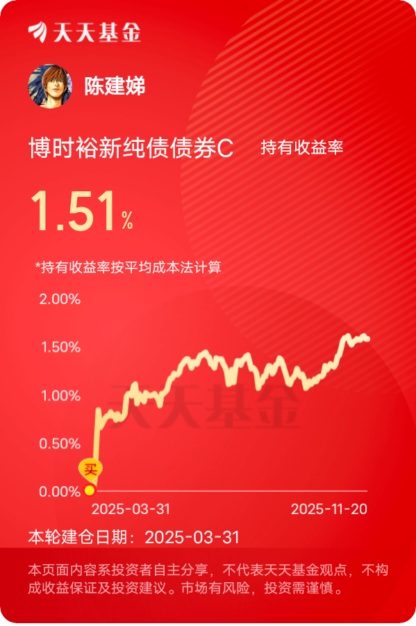 通胀数据不高,政策还有宽松空间,债市大环境不差。这只基以往业绩挺靠谱,看好后续表现#晒收益#