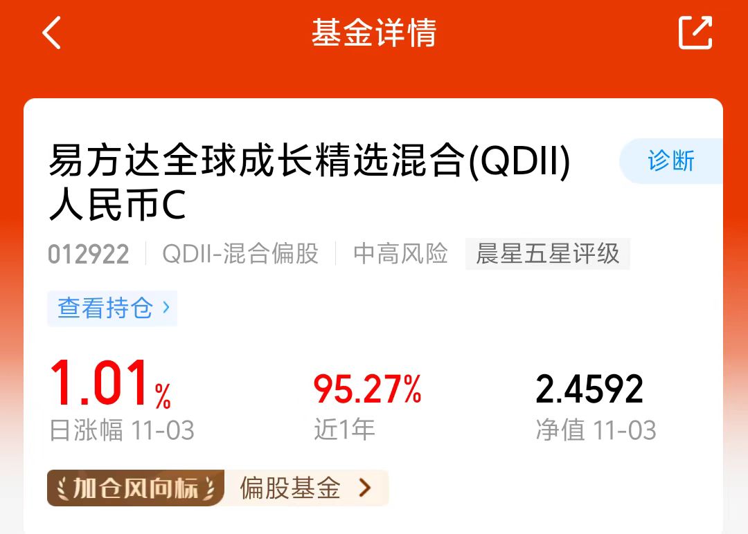 近期科技板块出现震荡,给了倒车接人的机会,全球科技板块呈现出不同的走势,所以投资科技板块时眼观不要居于一地需放眼全球,我选择配置$易方达全球成长精选混合(QDII)人$ 012922,这个基是比较稀缺的配置全球科技板块的龙头企业,业绩优秀近一年上涨了95.27%,通过长期持有取得好的收益!