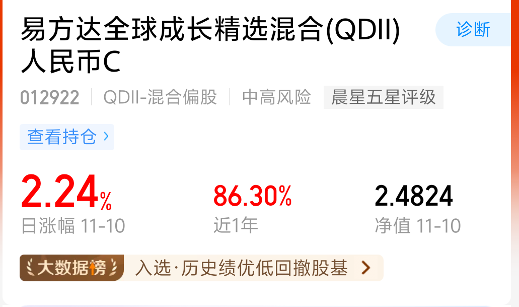 虽然最近科技板块有点震荡,还好我提前安排了$易方达全球成长精选混合(QDII)人民币C$ 012922,这个基是投资全球的科技基,其持仓在A股、港股、美股三地选择优质企业,是市场上比较稀有能再全球范围进行调仓的科技基,业绩也很强,昨日上涨了2.24%,近一年上涨了86.3%,可见这个基是比较能涨抗跌的,可见郑总的调仓能力非常强!