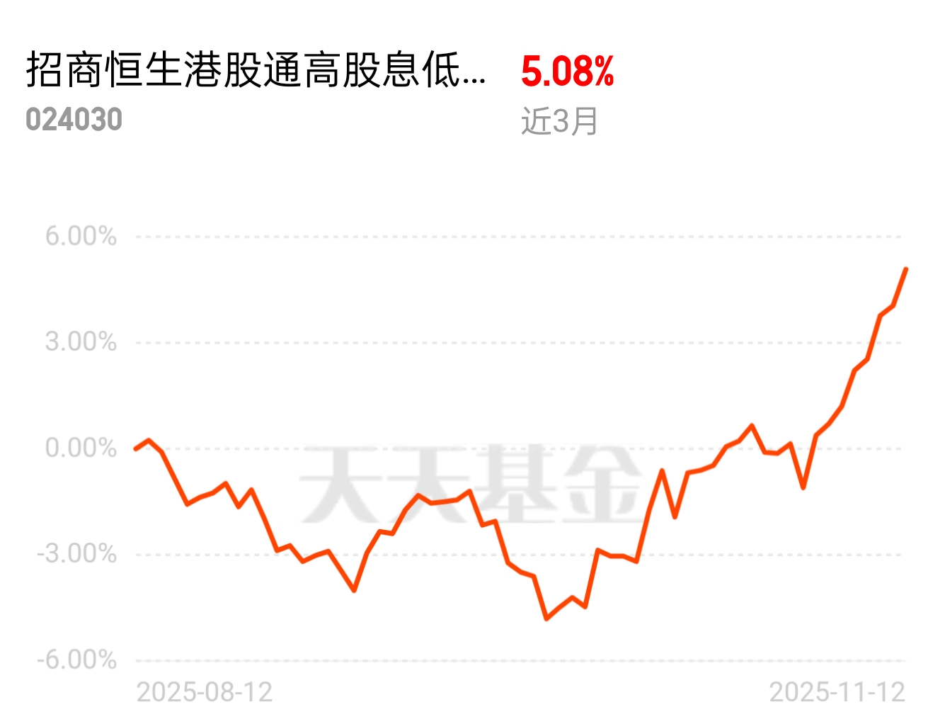 港股通资金持续净流入,高股息低波动的标的因为风险低、回报稳成为投资热点。招商恒生港股通高股息低波动ETF联接C近3个月涨了5.08%,指数6%高股息率很有吸引力,金融地产权重超60%,低波动+低费率+定期分红,底仓配置太合适。