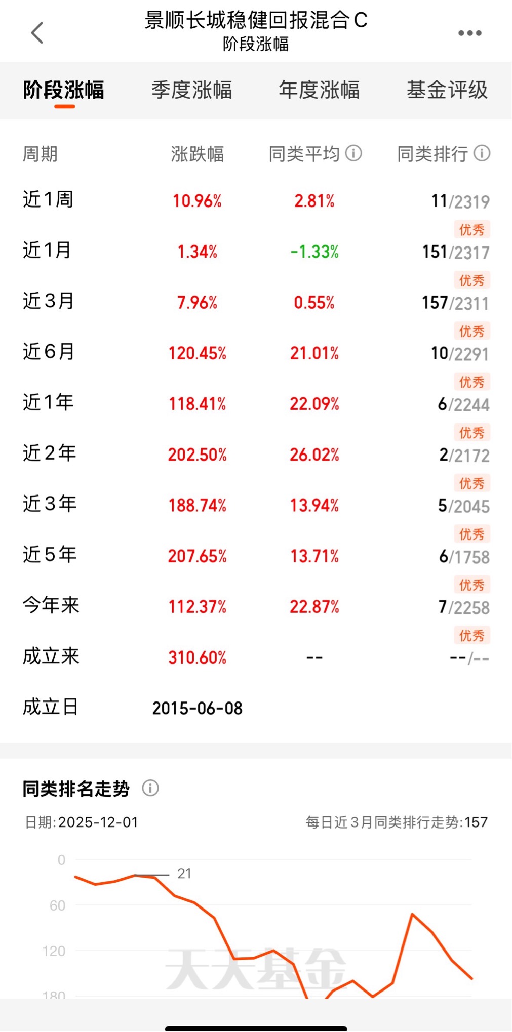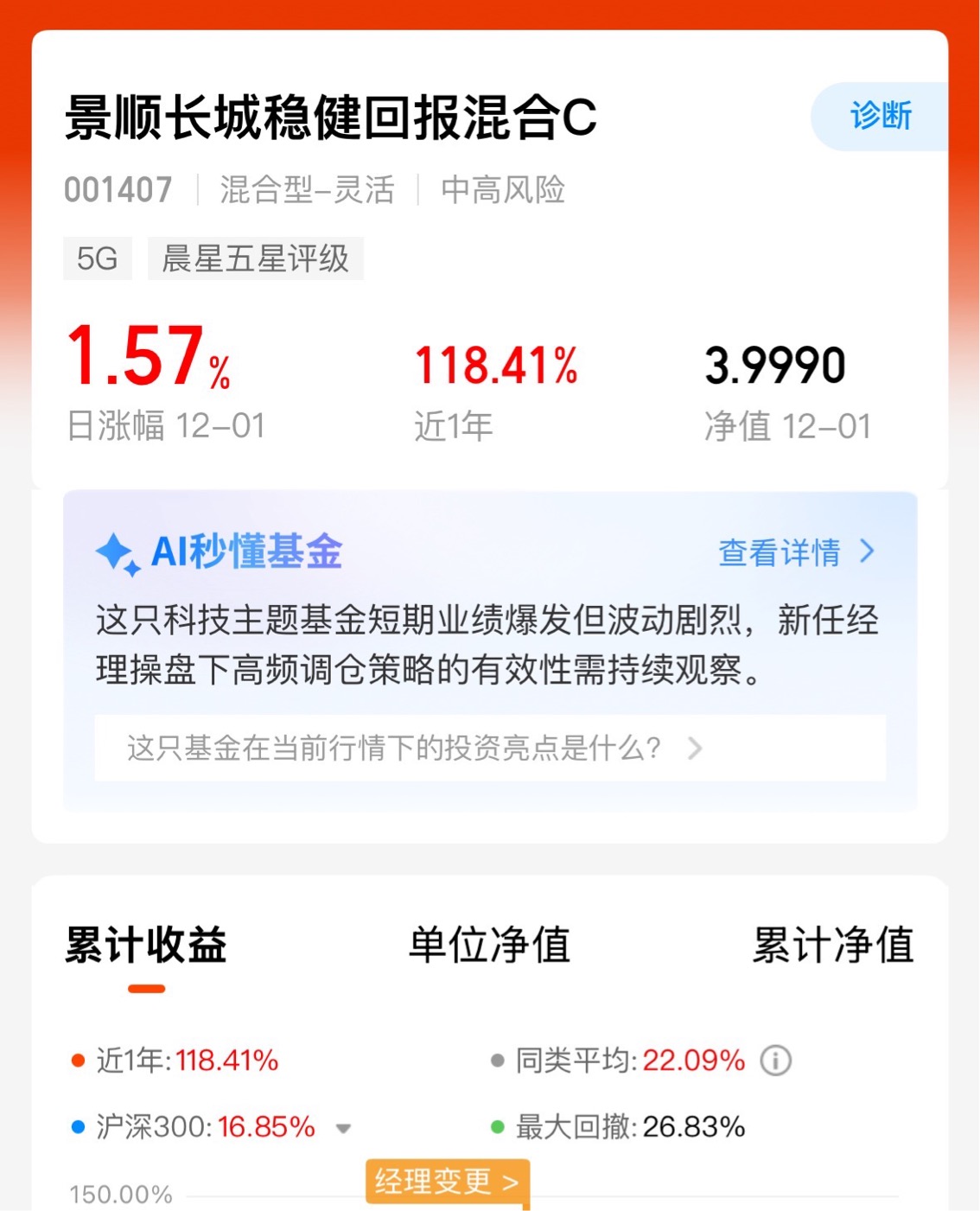 名叫“稳健回报”的科技基,近一年却有119%的激进表现,说明它名字的“稳健”可能指的是思路和框架稳,基金经理上大分#11月我的投资总结!# $景顺长城稳健回报混合C$