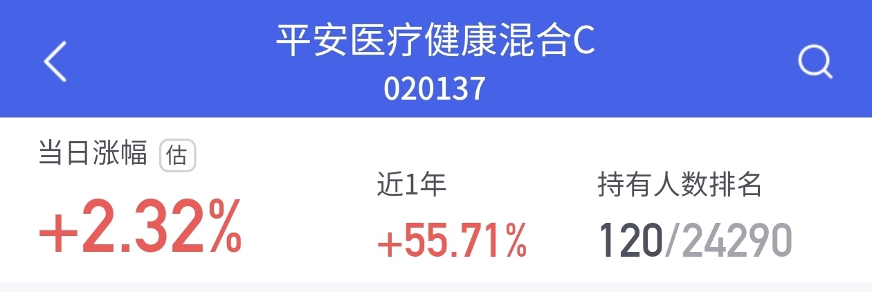 $平安医疗健康混合C$ 预估吃肉2.32%,真牛真牛呀,一下子两个多点的收益了呢,医疗相关的竟然这波也是反弹起来了,近一年也是55个点了