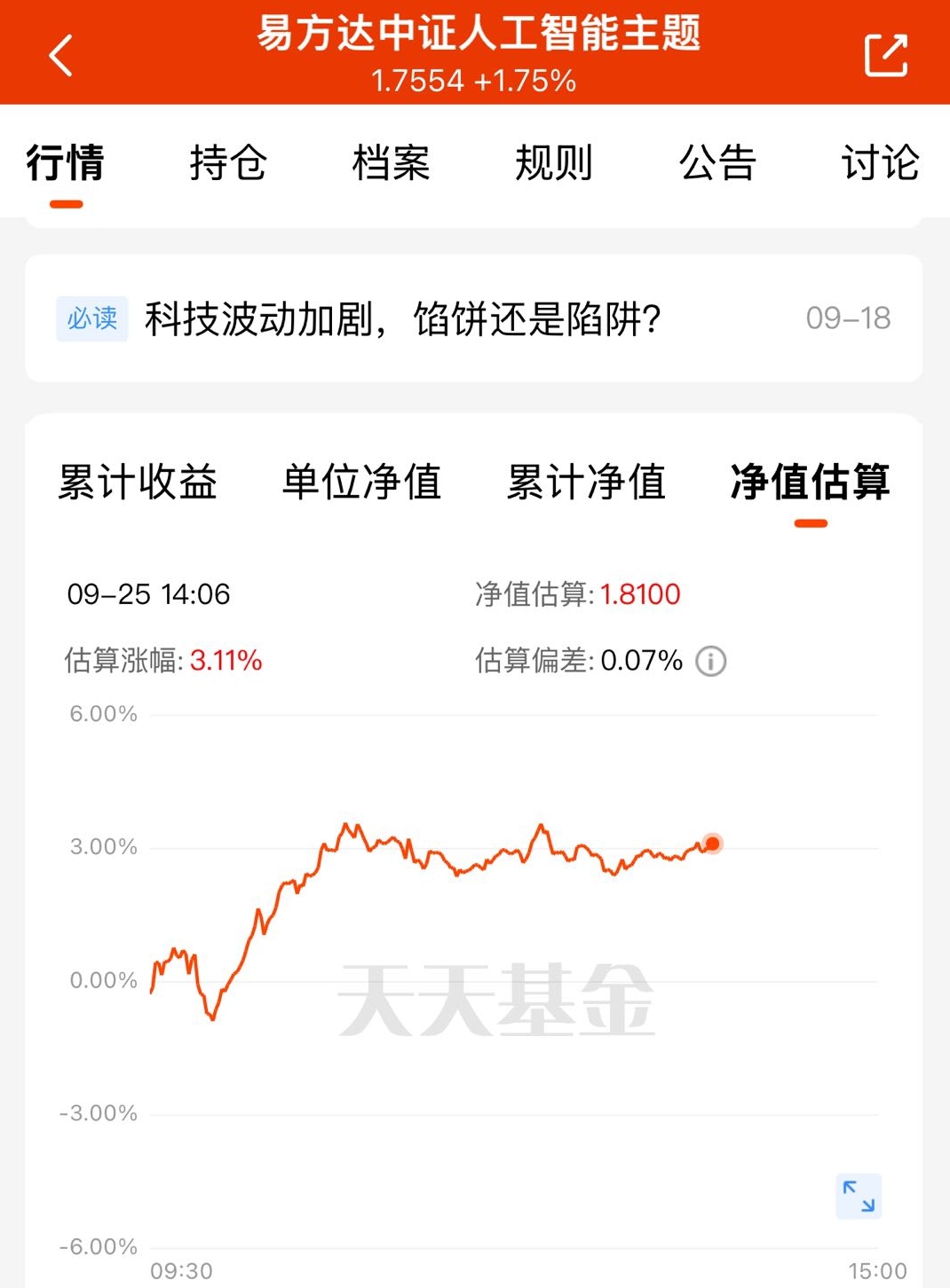 AI板块形势大好,今天涨幅可观,这波得抓住$易方达中证人工智能主题ETF联接C$