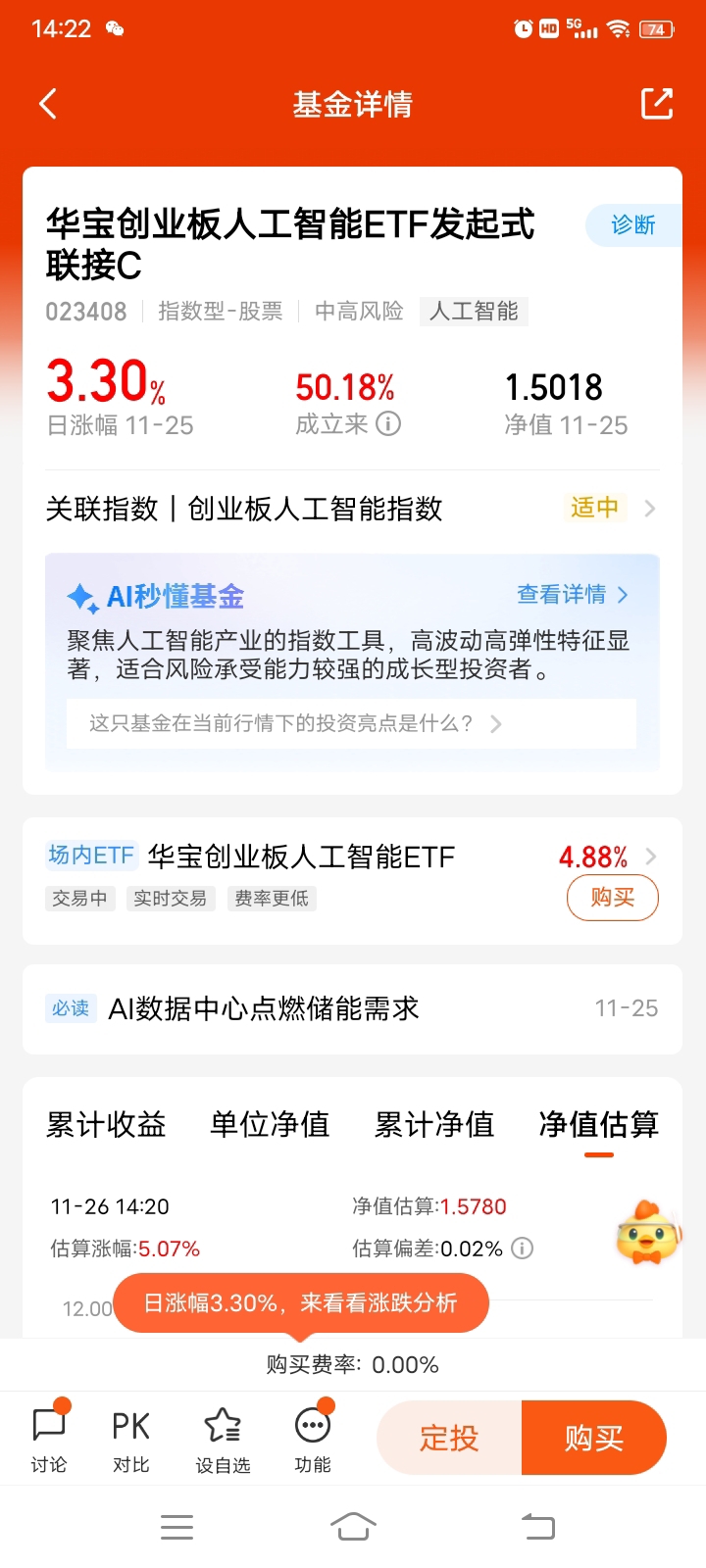 #低估补涨号启航# 老师您好!请教:关于$华宝创业板人工智能ETF发起式联接C$ ,心里的问号是越来越多,结合现在的市场行情,越看越迷茫。这段时间A股整体震荡得厉害,人工智能板块更是大起大落,前几天还因为某巨头发布新模型涨了一波,没过两天又因为行业监管传闻跌回去,这只基金跟着上蹿下跳,我完全摸不准它的节奏——到底是该跟着热点追涨杀跌,还是长期拿着等行业企稳?