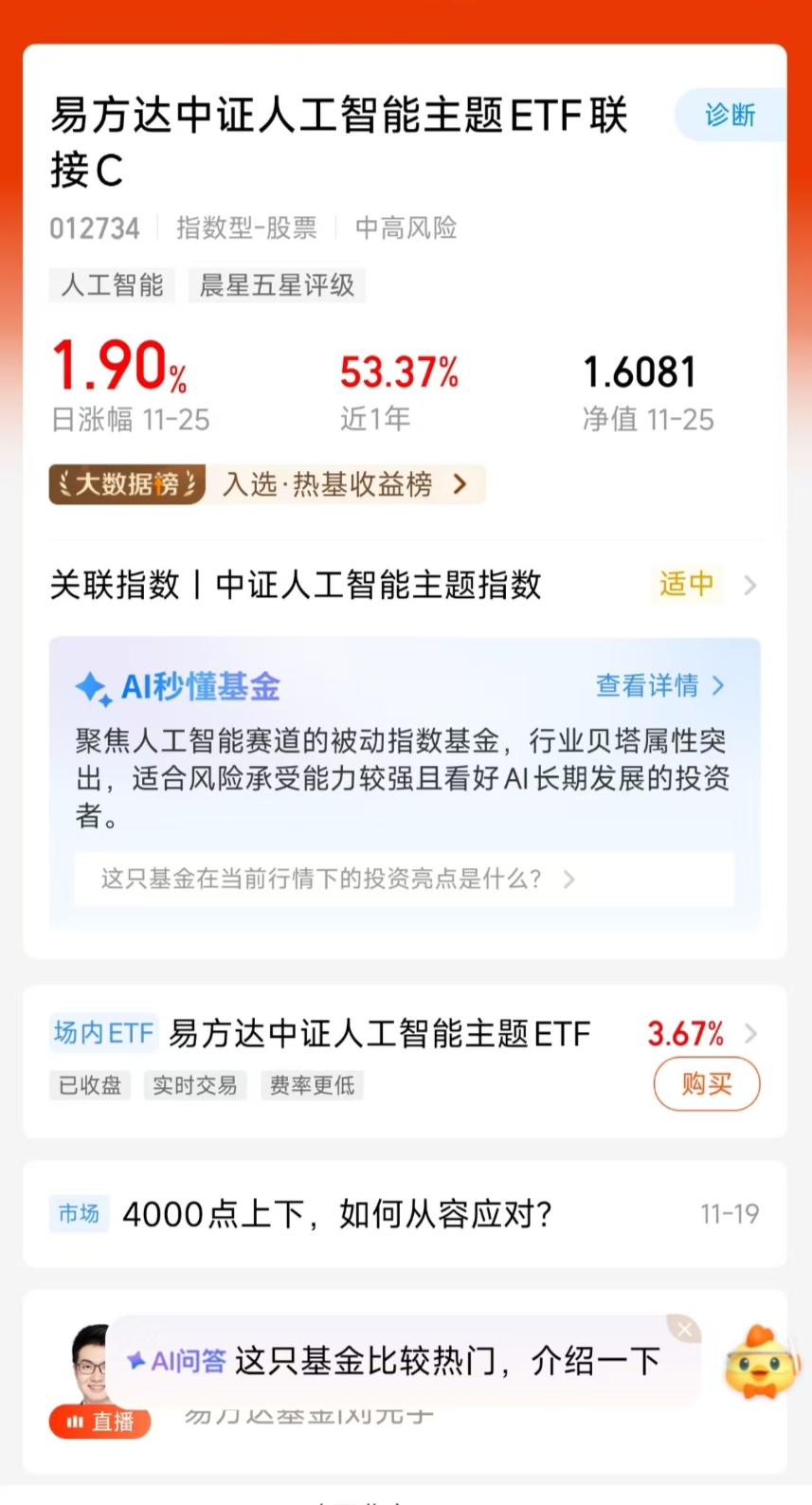 今天市场AI概念好像又活跃起来了,看到有些相关基金盘中涨得不错。咱们这个虽然只是