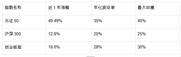 从数据可见,北证50指数在2025年年内累计涨幅达49.49%,位居A股市场基准指数第一,展现出强劲的增长势头。其年化波动率高达35%,远高于沪深300的20%,最大回撤曾达40%,但同时也具备高弹性特性,体现了高风险高回报的特征。