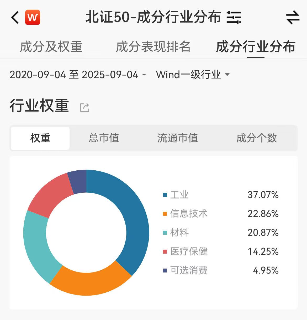 2. 行业分布:北证50指数行业分布广泛且具有鲜明特色,主要集中在专精特新科创领域。截至2025年7月,北证50成份指数持仓样本的行业分布为:工业占比37.07%、信息技术占比22.86%、材料占比20.87%、医疗保健占比14.25%、可选消费占比4.95%。