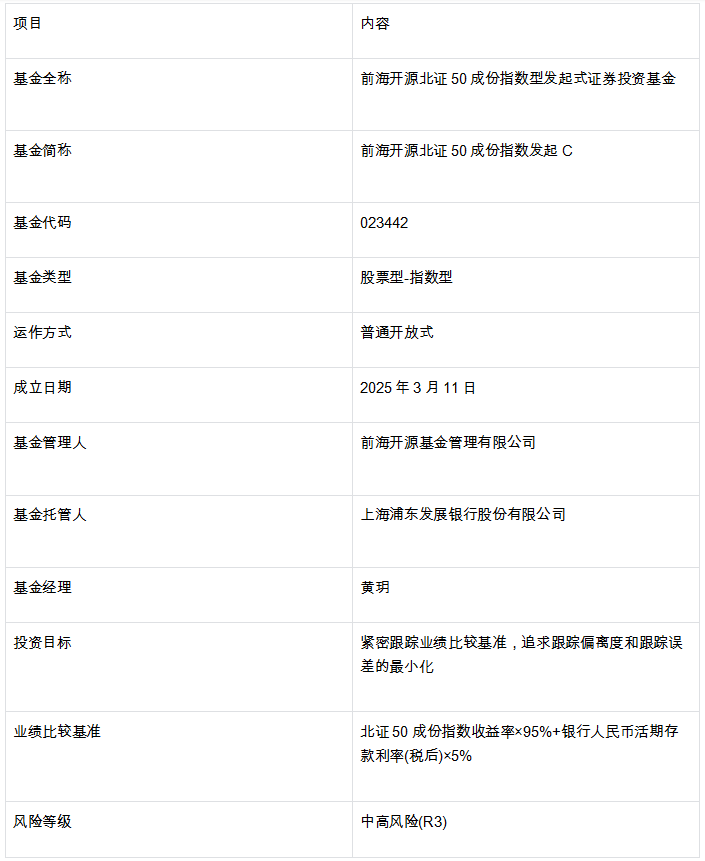 前海开源北证50成份指数发起C(023442)是一只股票型指数基金,采用完全复制法跟踪北证50指数,于2025年3月11日正式成立,是市场上较早布局北交所核心资产的指数基金之一。基金的投资目标是"紧密跟踪业绩比较基准,追求跟踪偏离度和跟踪误差的最小化",属于中高风险产品。