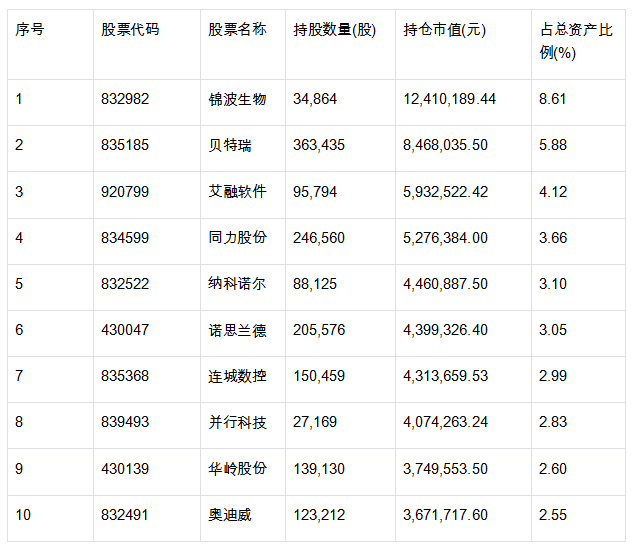 前十大重仓股合计占比达39.39%,包括锦波生物(8.61%)、贝特瑞(5.88%)、艾融软件(4.12%)等,行业覆盖生物医药、高端装备、半导体等战略新兴产业。