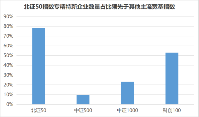 而北证50指数的专精特新基因十足,专精特新企业在北证50指数成分股中的数量占比超过70%,领先于中证500、中证1000等中小盘风格宽基指数。专精特新企业的创新能力突出,成长性强,有望推动指数长期向上发展。