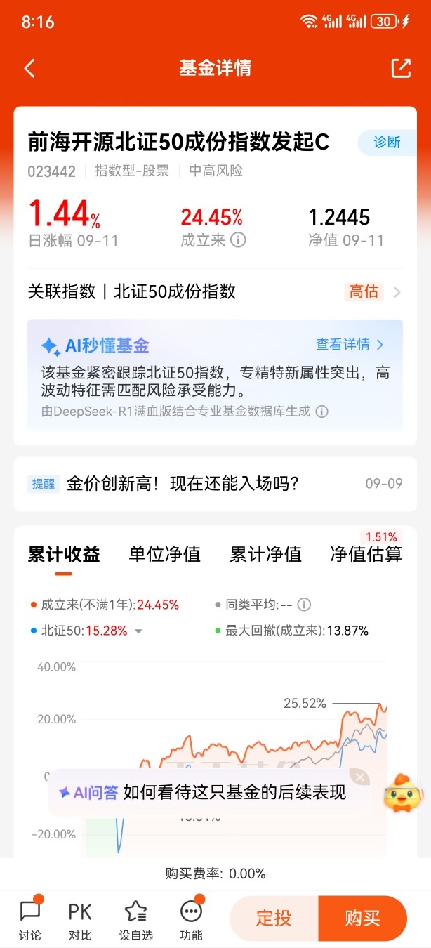 我已将$前海开源北证50成份指数发起C$ 加入自选。前海开源北证50的任务就是紧紧跟踪北证50指数,力求做到和指数亦步亦趋。那投资它有啥好处呢?
