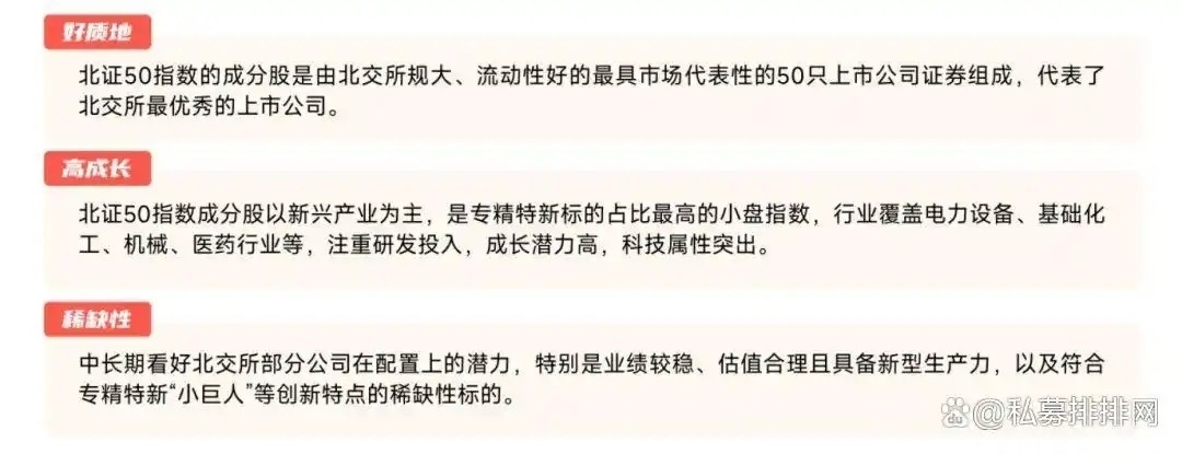 1. 政策推动:北交所作为服务创新型中小企业的主阵地,得到了政策的大力支持。随着一系列改革措施的逐步落地生效,北交所将迎来高质量扩容,汇聚更多创新成色足、成长性强的专精特新“小巨人”企业。这将为北证50指数提供坚实的业绩支撑。