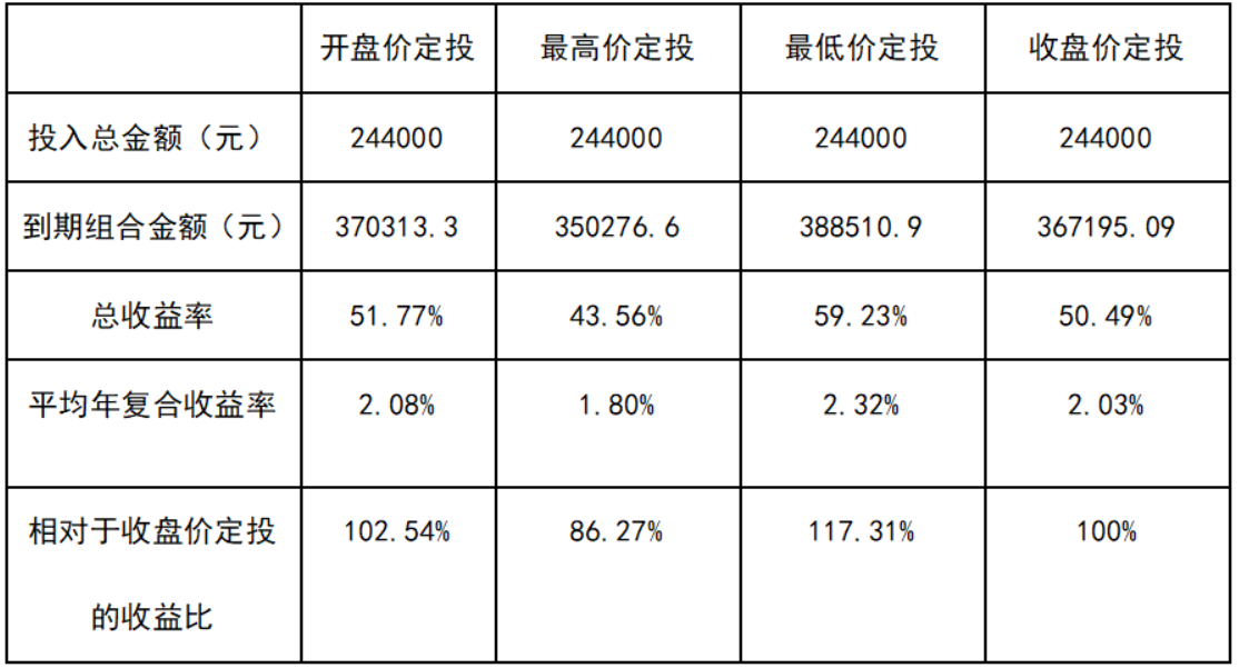 注:17.31%=(最低价定投总收益率59.23%/收盘价定投总收益率50.49%)-1。