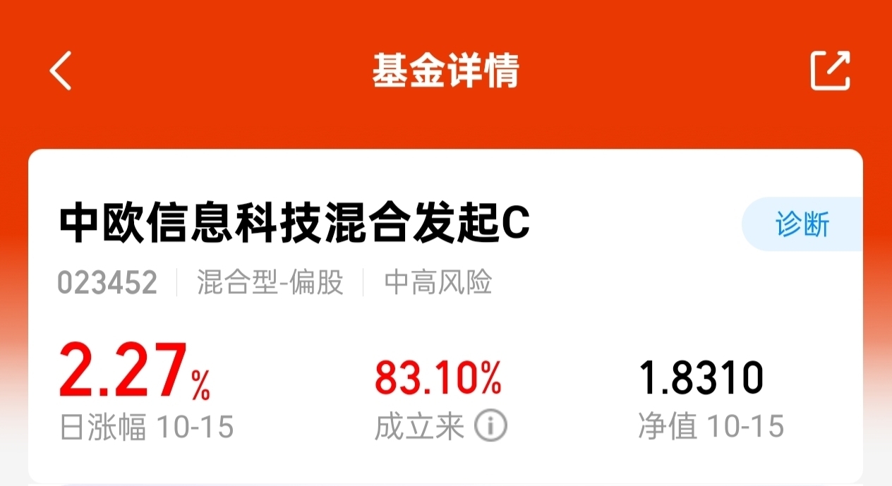 今天市场里科技股表现不错,AI、芯片这些板块都涨了。我关注的$中欧信息科技混合发起C$ 今天也跟着涨了2.27%,这个涨幅在同类基金里算是比较好的。
