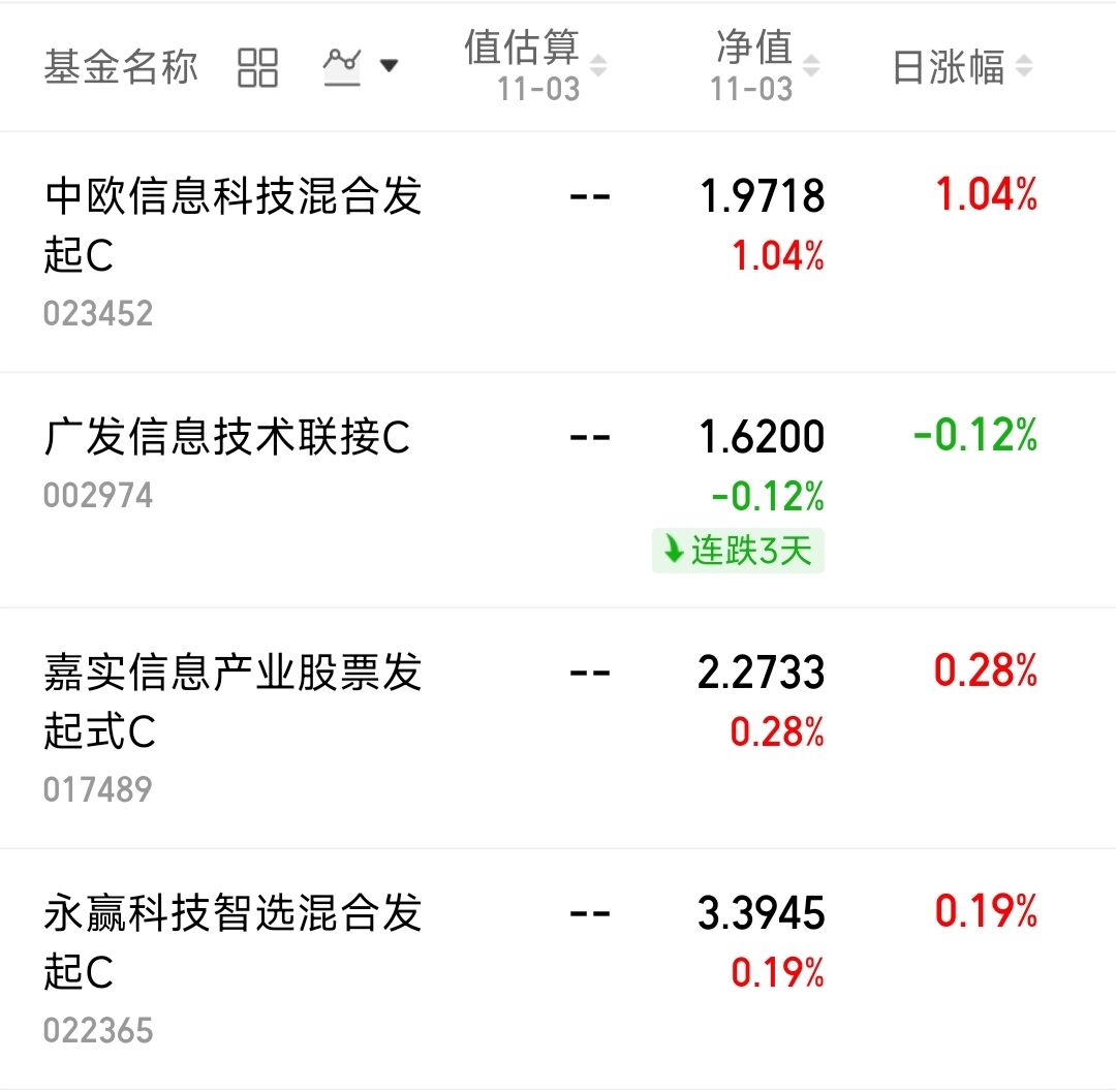 今天 A 股反弹力度有限,早盘主要靠三桶油、中字头、银行这些权重护盘,直到午后科技板块回暖、光伏设备拉升,情绪面好转,三大指数才翻红。不过从我得自选基金中,不能发现,科技分化还是很大的,$中欧信息科技混合发起C(OTCFUND|023452)$今天上涨1.04%,$广发信息技术联接C(OTCFUND|002974)$下跌0.12%,$嘉实信息产业股票发起式C(OTCFUND|017489)$上涨0.28%,$永赢科技智选混合发起C(OTCFUND|022365)$上涨0.19%。
