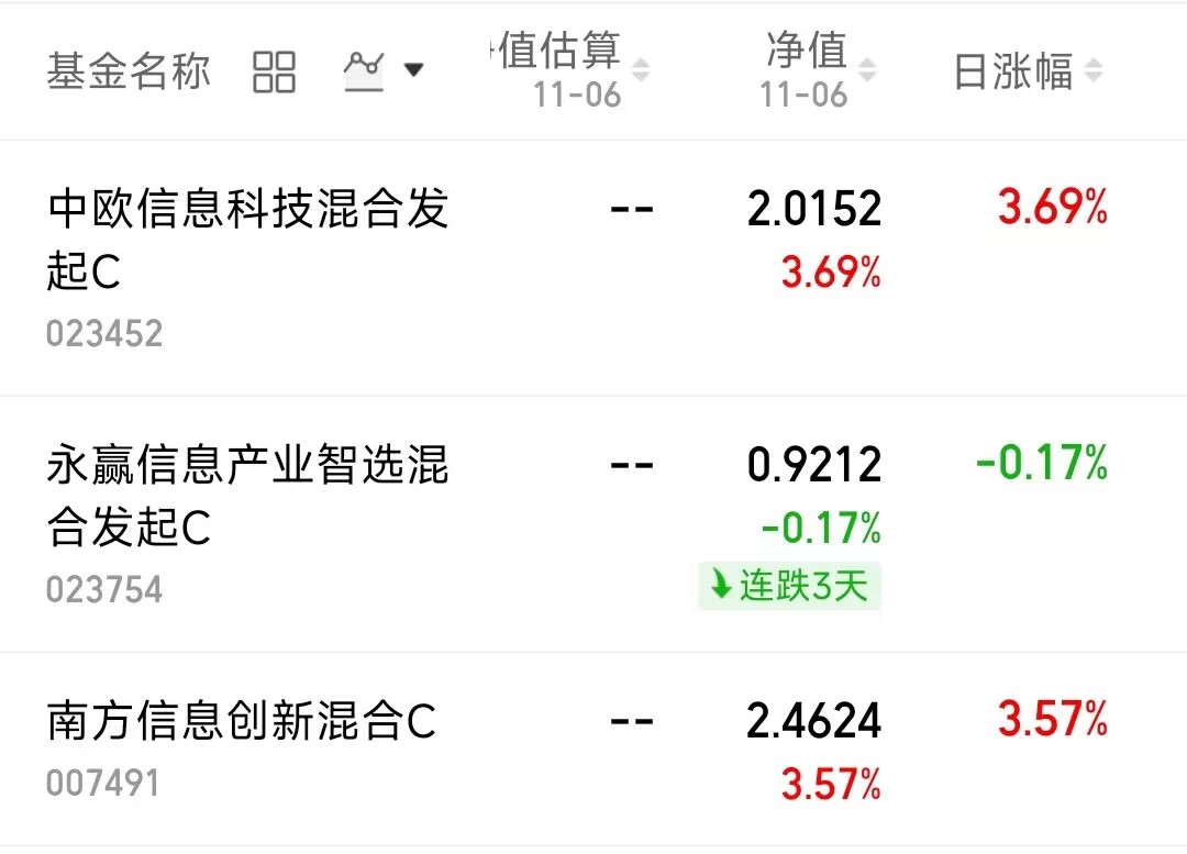 今天的行情虽然说突破了4000点,但分化还是比较厉害的,尤其是板块内部的分化,权重继续向上,而非权重反而出现了回落,$中欧信息科技混合发起C(OTCFUND|023452)$上涨3.69%,$永赢信息产业智选混合发起C(OTCFUND|023754)$下跌0.17%,$南方信息创新混合C(OTCFUND|007491)$上涨3.57%。