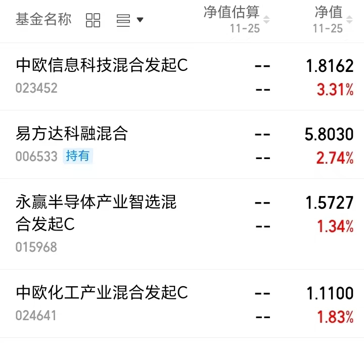 今天A股市场持续走高,表现不错,科技板块也是全面反弹了,受益于AI 算力需求爆发与国产替代推进,AI产业链上下游协同发力,虽部分领域存在估值波动,但长期成长逻辑未变。一起看看今晚净值更新表现: