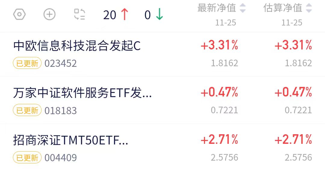 $中欧信息科技混合发起C(OTCFUND|023452)$上涨3.31%$万家中证软件服务ETF发起式联接C(OTCFUND|018183)$上涨0.47%