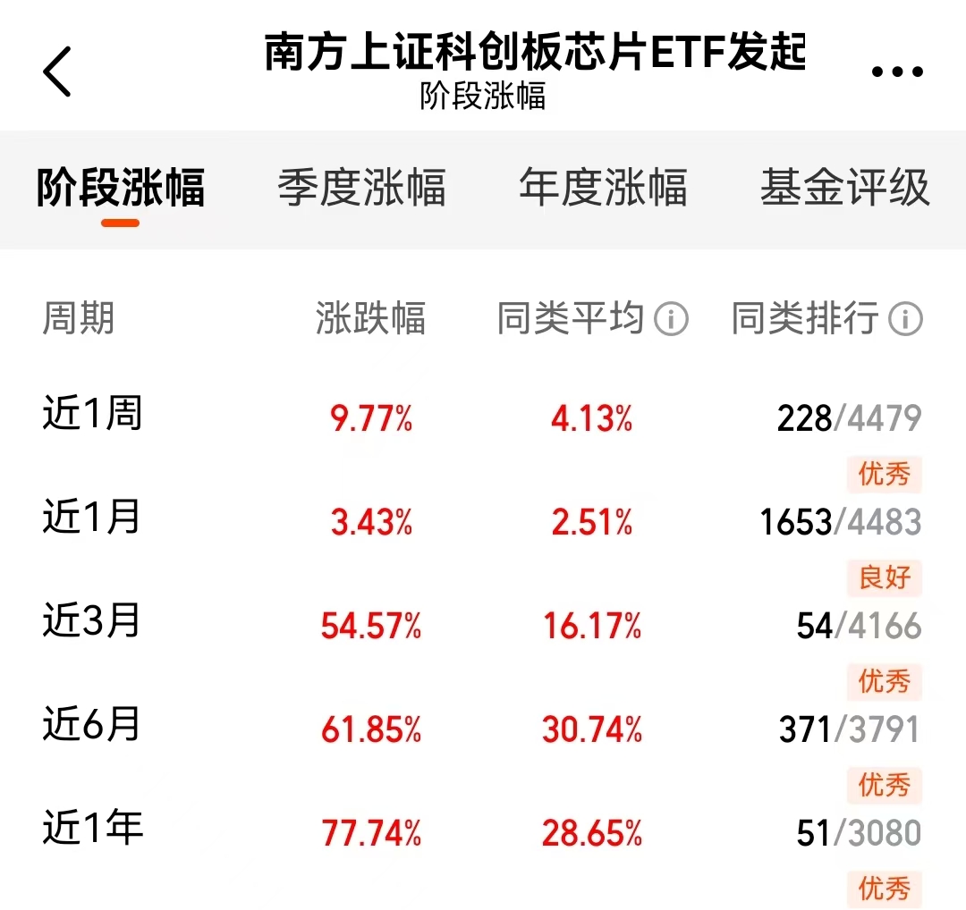 最近这市场,逮着机会就得狠狠把握住!看看$南方上证科创板芯片ETF发起联接A$(021607)这表现,近三个月直接干了54%多的收益,同类排名第一;近一年更是涨了77%多,还是同类第一!这数据摆在这儿,明眼人都知道该往哪儿看。市场里能这么精准抓住芯片领域机会的产品可真不多见,这基金算是其中一个。现在的行情可不是天天有,这种跟着指数走的透明方式,省心省力,表现还这么猛,真是让人心动不已。#沪指盘中突破4000点!下个目标位在哪?#